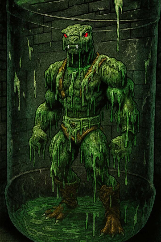 Kobra Khan stood within the containment chamber like a specimen. The vertical stasis field wrapped around him in layers of shimmering energy that bent light into prismatic fragments. His body gave involuntary twitches—muscle memory fighting against the field’s influence—while thick strands of corrupted Slime still clung to his arms and chest like syrup, dripping to the chamber floor in lazy, viscous threads that hissed softly when they made contact with the stone.