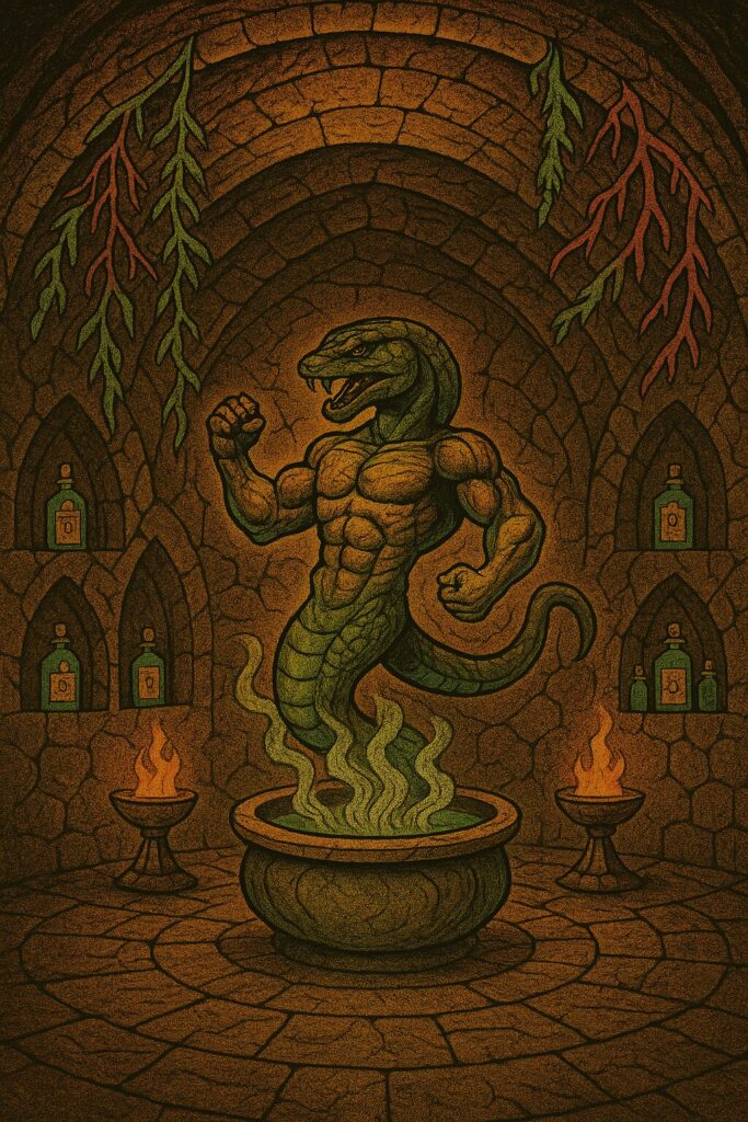The chamber’s perimeter was lined with slit-shaped alcoves, each one a miniature pharmacy carved into the living rock. Glass vials caught the amber light—some containing salves that could heal wounds that should have been fatal, others holding tinctures capable of purging toxins from blood and soul. The labels, written in the flowing script of the Snake Men’s most ancient tongue, told stories of remedies passed down through bloodlines older than recorded history.