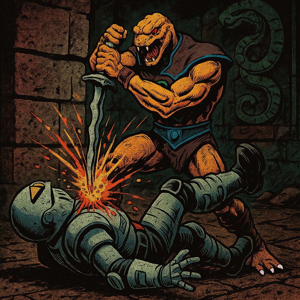 Rattlor surged forward in fluid motion, his massive form coiling and striking with the rhythm of a war drum. His tail—thick as a tree trunk and twice as deadly—whipped through the air with a sound like thunder. It connected with the second Trooper’s chest plate, denting armor designed to withstand plasma fire. The Trooper flew backward, slammed into the temple wall, and showered the chamber with golden sparks that danced like angry fireflies. The first Trooper’s systems rebooted with electronic chirps and whirs. It raised its blaster, energy crackling down the barrel—only for Scales to surge in from the side, eyes blazing with more than battlefield fury. This wasn’t just combat. This was personal for the brother he lost.