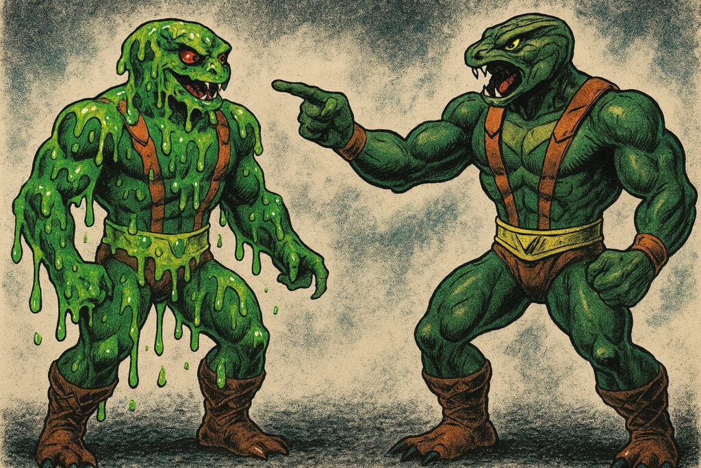 In Tales of the Snake Men: Book Three – Chapter 6, this chapter marks the shift where Khan’s inner war becomes literal, revealing the full form of Slime-Khan for the first time. Skeletor’s purification ritual tears open Khan’s mind, forcing him into a brutal confrontation with the monster wearing his face.